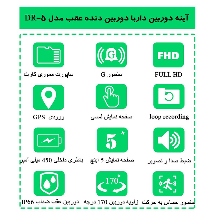 صفحه نمایش 5 اینچی: آینه مانیتوردار خودرو دارای یک صفحه نمایش دیجیتالی ۵ اینچی است که تصاویربرروی آن قابل مشاهده هستند.