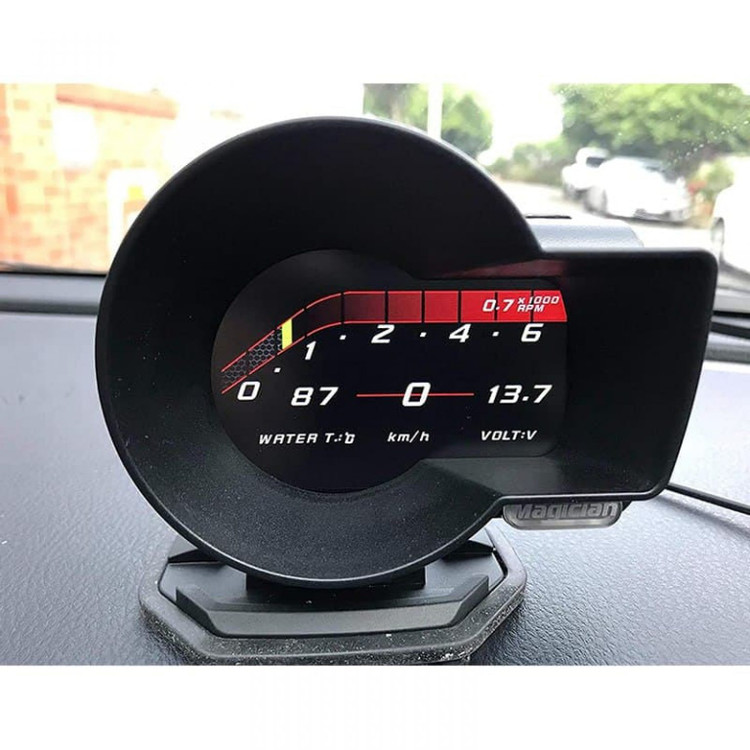 مولتی گیج MAGICIAN 7607 دارای پورت دیاگ OBD2 جهت اتصال به پورت دیاگ خودرو دارای ولوم تغیر وضعیت و دمو و تنظیمات دارای پد نگهدارنده گیج برروی داشبورد دارای سنسور نور